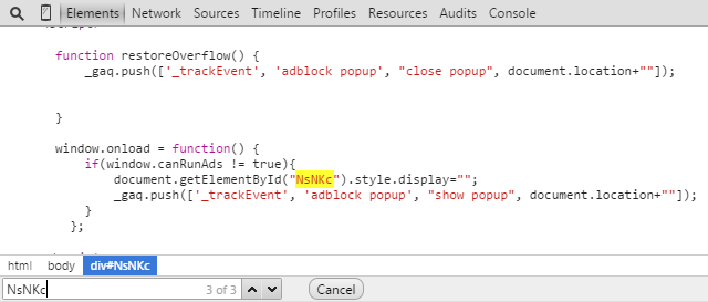 document.body.appendChild(script);This code uses the window.onerror function to catch failed http request which in our case is the blocked the Ad script. In the source code of the nag screen you can see that is uses the css class headline. If you search for it in the html you will see that it is only used in the nag screen. That allows us to use that class to find the nag screen with a jquery selector and from there to traverse up the DOM tree to find the main div of the nag screen that has a random id. Install Tampermonkey for Chrome or Greasemonkey for Firefox and add a new user script with the following content: