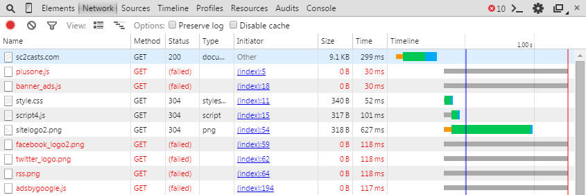 Right click on each of the blocked scripts and select Open in new tab. The url http://sc2casts.com/tt/banner_ads.js reveals an interesting script: